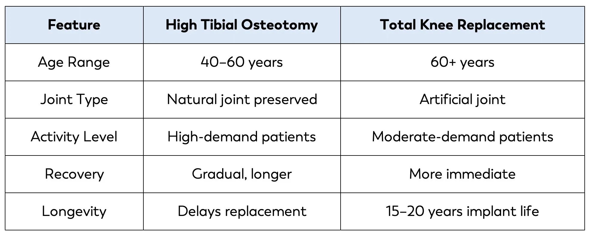HTO allows patients to resume sports, work, or physical hobbies that may be restricted after a total knee replacement.